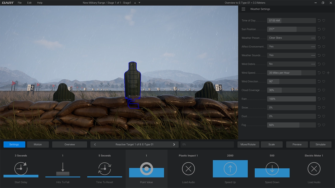 DART 2.2 includes the most realistic weather system ever designed for a firearms simulator. Select from more than a dozen weather presets, or create your own. Not only does it look realistic, but it also realistically affects objects in the scene. Rain forms puddles on the ground, snow accumulates, and dirt builds up on targets during dust storms. It also plays an important part in our ballistics systems as well.