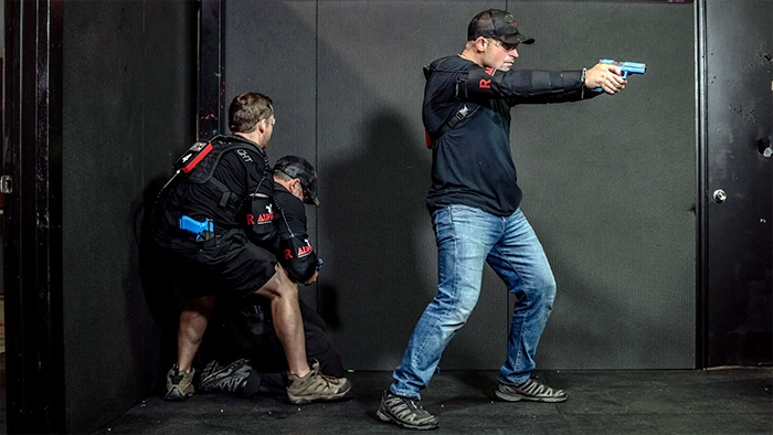 Red Fire can be used in ‘wide mode’ to detect room-wide “shots” that will activate sounds and lights on the vest unless the trainee is behind cover. Narrow mode can be used to provide feedback when the trainee does not move off the “X” after a specified time, training the student to move at least a full body position away from their previous location.